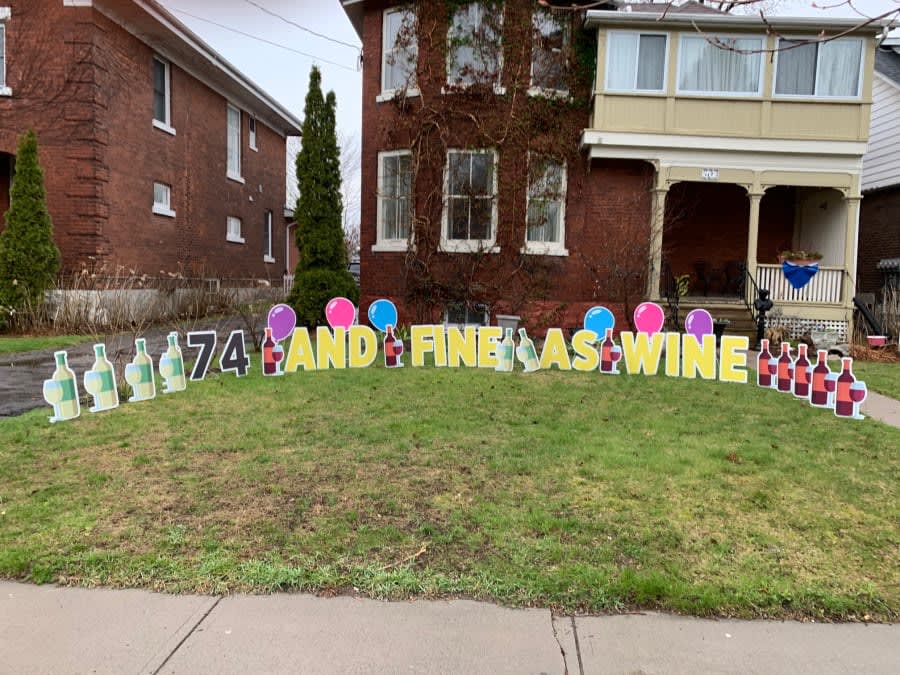 If you want a different saying on the lawn, let us know, we can customize it how you want! Includes the 2' letters, wine glasses with bottles, balloons and the age! As with any Yard Greeting, We can add the person's name on the lawn too!