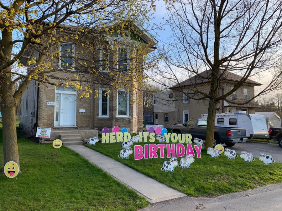 This Happy Birthday Yard Greeting rental sign is great for any age or any occasion. You can celebrate the animal lover in your life with a special message on the lawn. These colourful cows can be used to say Happy Birthday, send Well Wishes or even Merry Christmas.